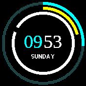 A beautiful digital clock with large ring guage, idle timer and a cyclic information line that includes, day, date, steps, battery, sunrise and sunset times