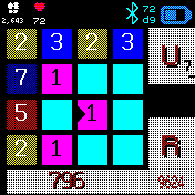 In Dark theme with numbers: Screenshot from the Banglejs 2 watch with the game in dark theme